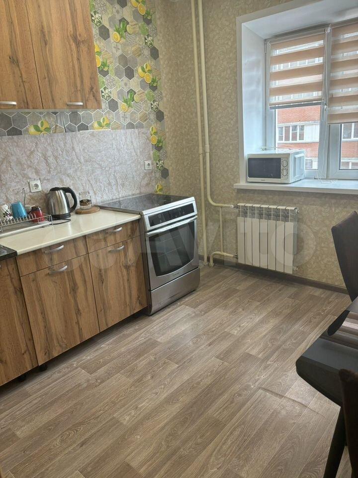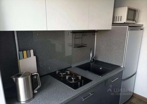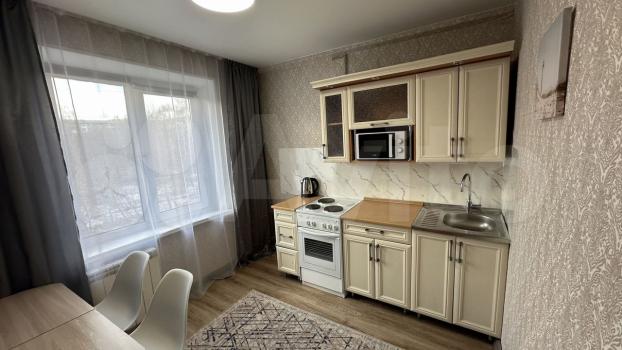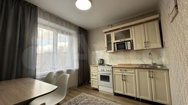 В квартирe устaновлeнa современная мебель: шкафы и диван в гостиной, а также обеденный стол и стулья на кухне, кухонный гарнитур. Из техники имеется холодильник, плита и стиральная машина.
