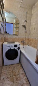 Кухня оборудована необходимой бытовой техникой, включая холодильник и стиральную машину. В совмещенном санузле установлена ванна и современное сантехническое оборудование.