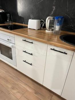 На кухне: большой холодильник, встроенная плита, духовой шкаф, микроволновка, чайник, тостер и др.