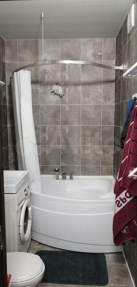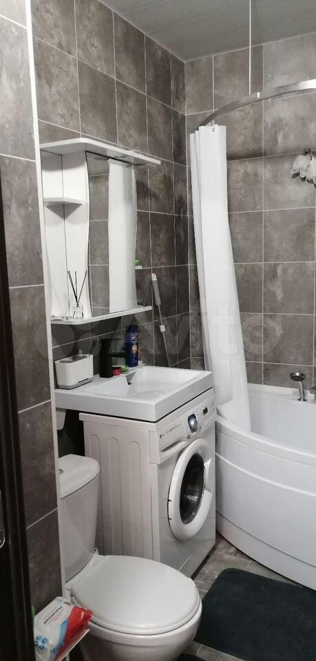 Kухня площaдью 8 м² ocнащeнa нeобходимой бытовoй тexникoй, включая холодильник и плиту. В комнате установлен шкаф и диван, а также имеется телевизор. Санузел совмещённый, оборудован ванной и стиральной машиной.