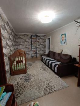 Есть диван, кресла, стол, стулья, шкаф, гладильная доска, микроволновка и морозилка и пылесос в комнате.