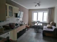 В квартире выполнен косметический ремонт от застройщика, в комнате для проживания есть шкаф-купе, диван, стол со стульями. В кухонной зоне находятся гарнитур с мойкой, плита и холодильник, стиральная машина. В санузле есть унитаз, ванная и раковина.