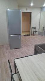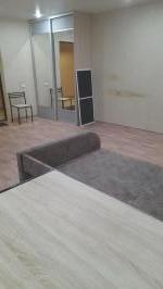 В квартире выполнен косметический ремонт от застройщика, в комнате для проживания есть шкаф-купе, диван, стол со стульями. В кухонной зоне находятся гарнитур с мойкой, плита и холодильник, стиральная машина. В санузле есть унитаз, ванная и раковина.