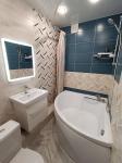 В комнате установлена современная двуспальная кровать и телевизор. Совмещенный санузел оборудован ванной. В квартире есть гардеробная для удобного хранения вещей.
