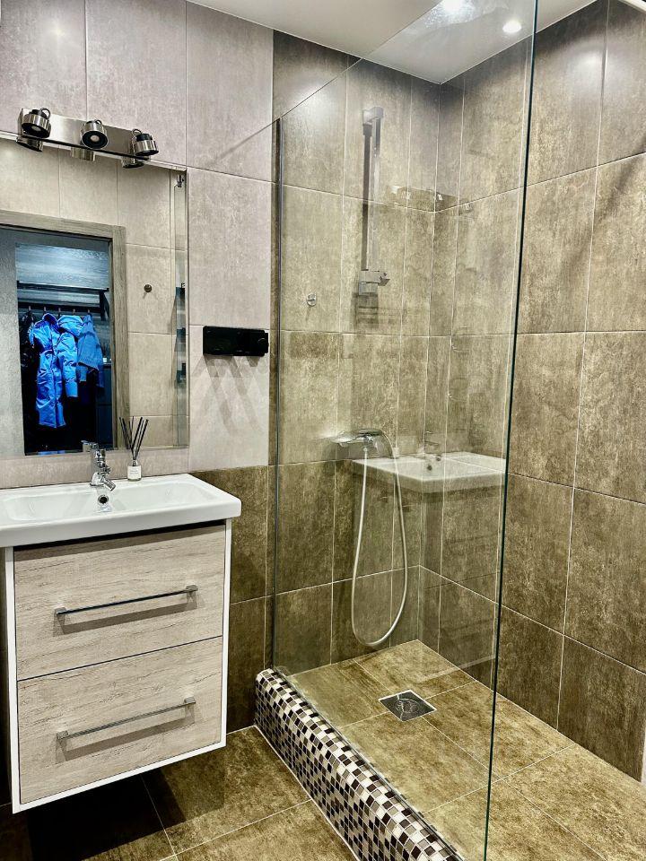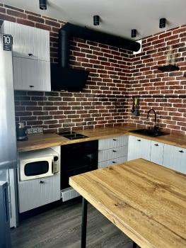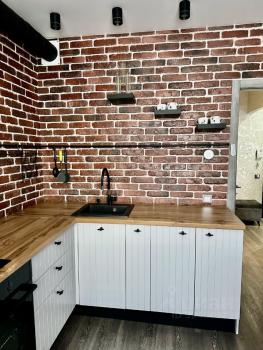 В квартире сделан современный евроремонт. Она полностью меблирована: мебель есть как на кухне, так и в комнате. В кухне установлена вся необходимая техника: кондиционер, холодильник, стиральная машина и телевизор. Санузел совмещённый, оборудован душевой кабиной, что делает пребывание здесь ещё более комфортным.