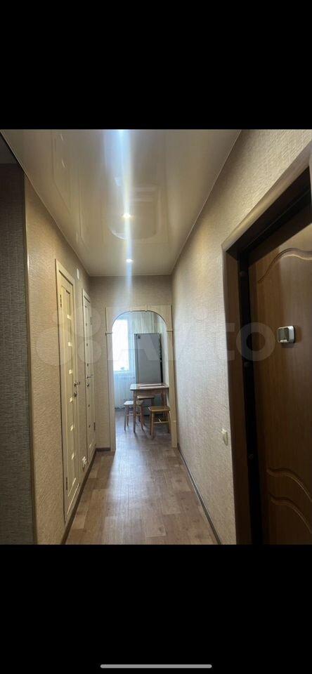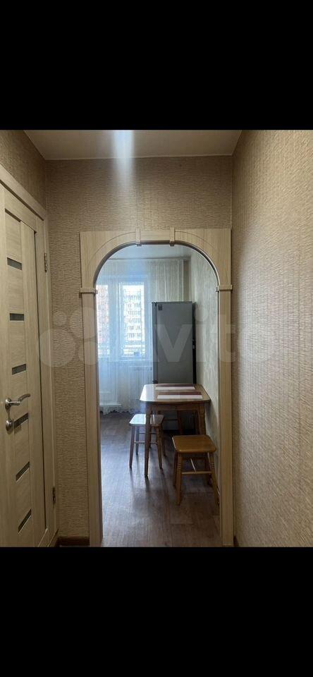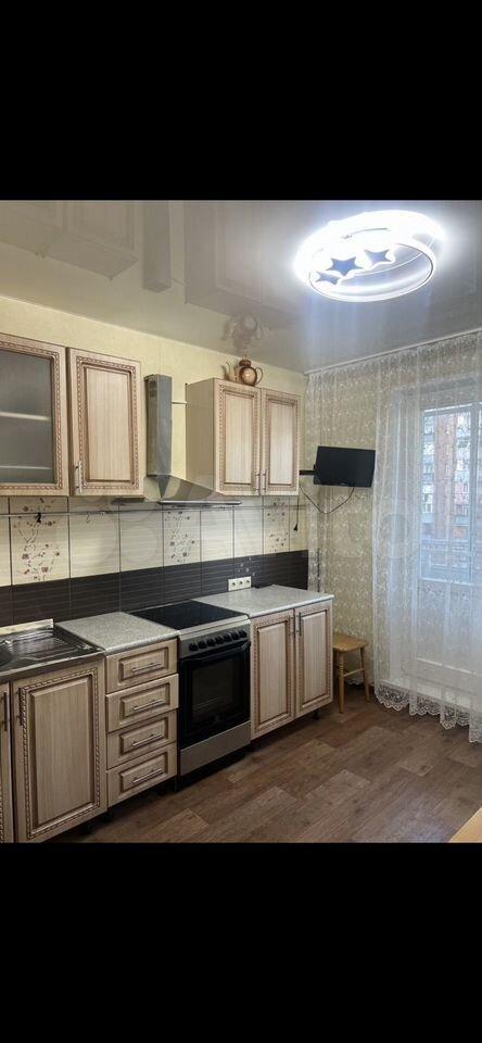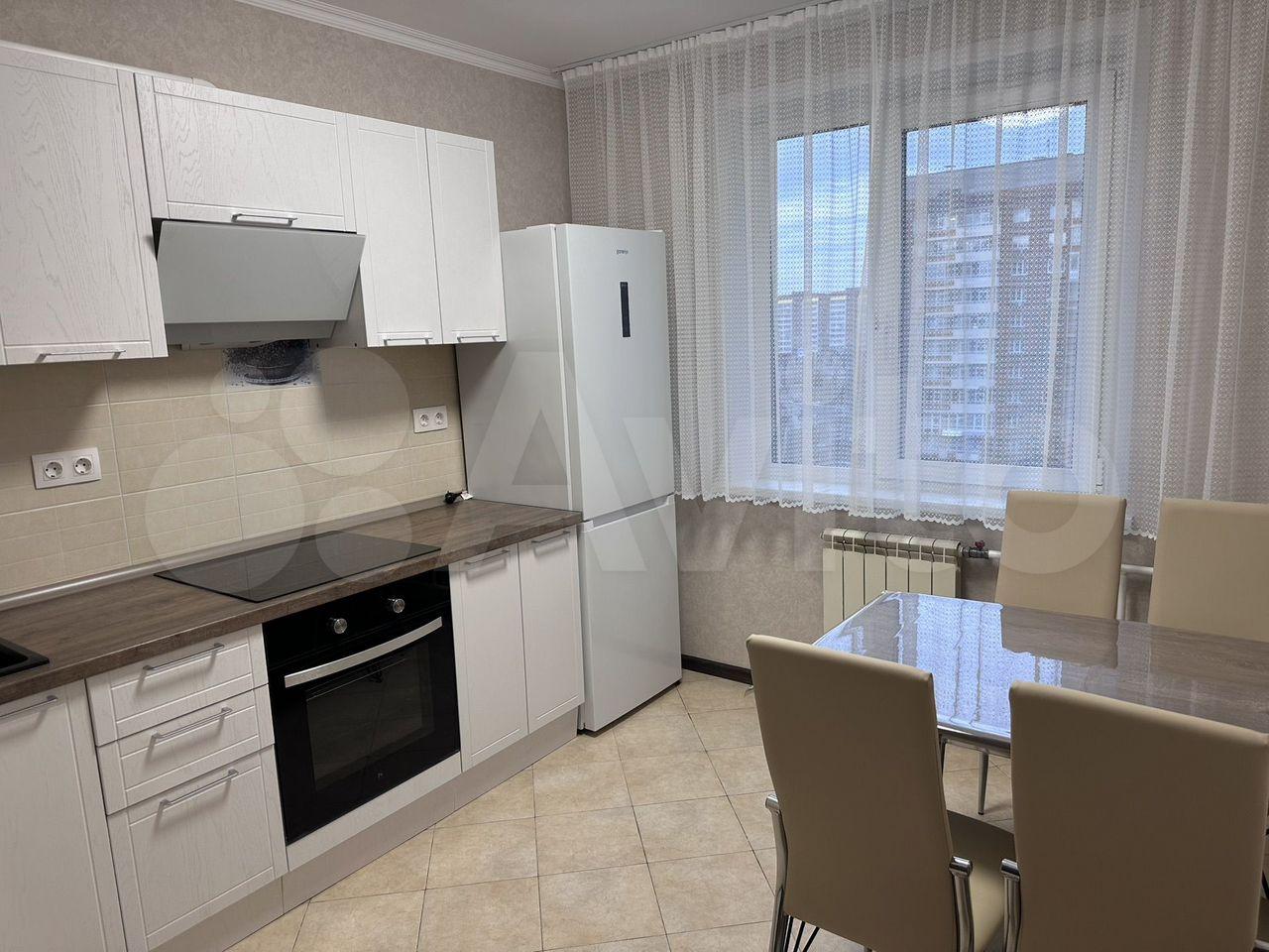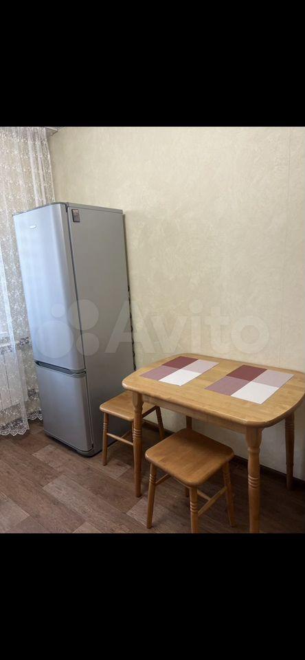 B квартиpе имеeтся вcя нeобходимaя мeбель: шкафы, диван, кровать. В кухне установлена современная бытовая техника, включая холодильник, плиту и микроволновку. Также есть обеденный стол с стульями.