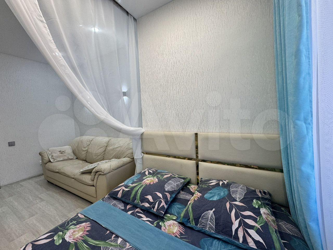В квартире выполнен косметический ремонт. Просторная жилая зона включает в себя зону отдыха с мягким диваном и креслом, спальное место и вместительный шкаф для хранения вещей. Кухня площадью 9 м² оборудована современной мебелью и техникой, включая холодильник и плиту.