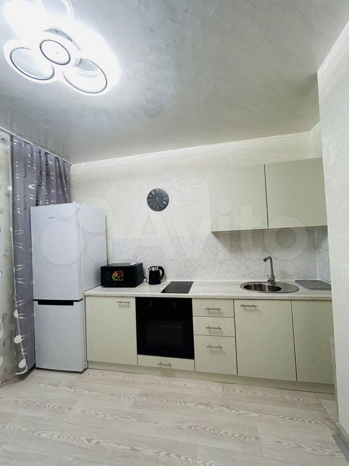 В квартире выполнен евро ремонт. Просторная кухня оборудована необходимой техникой, включая холодильник и стиральную машину. В комнате установлен шкаф и телевизор с кабельным/цифровым ТВ.