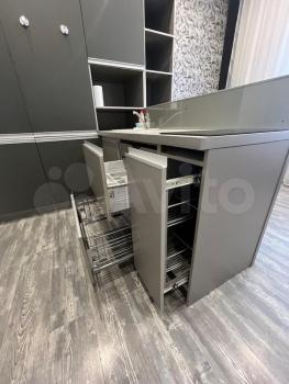 - На кухне хороший кухонный гарнитур с барной стойкой, керамической раковиной, холодильником, морозильной камерой, варочной керамической индукционной поверхностью, встроенной стиральной машиной, стол и стулья.