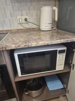 Из мебели: кухонный гарнитур, большой вместительный шкаф, горка, стол, стулья. Бытовая техника: холодильник, стиральная машина, печка, микроволновка, утюг. Кровать или диван - по согласованию.