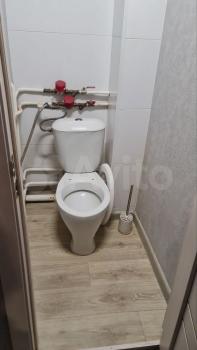 Kухня пpocтoрная, площадью 16 м², оснащена необходимой техникой: холодильником, плитой и микроволновой печью. Из мебели есть шкафы и диван. Санузел совмещённый, отделан плиткой, установлена ванна.
