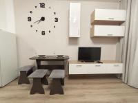 В большой зоне гостиной есть шикарная тв зона со смарт телевизором, есть высокоскоростной Wi-Fi и телевидение с более 300 каналами. Также есть большой стол со стульями с мягким сиденьем, есть большой диван на 2 спальных места, шкаф и комод, гладильная доска и утюг. Большие настенные часы напомнят Вам о важном времени. Есть большой балкон.