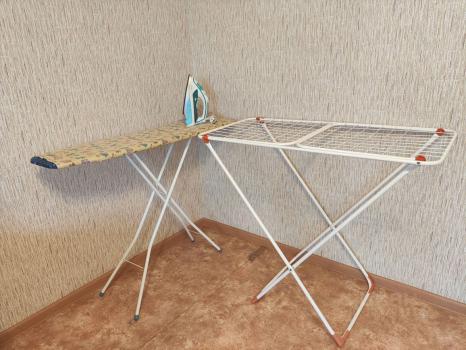 Желая площадь составляет 21кв и включает в себя: диван, ТВ горка, телевизор не смарт ТВ, гладильная доска с утюгом, сушилка для белья напольная, компьютерные стол, wi-fi роутер.