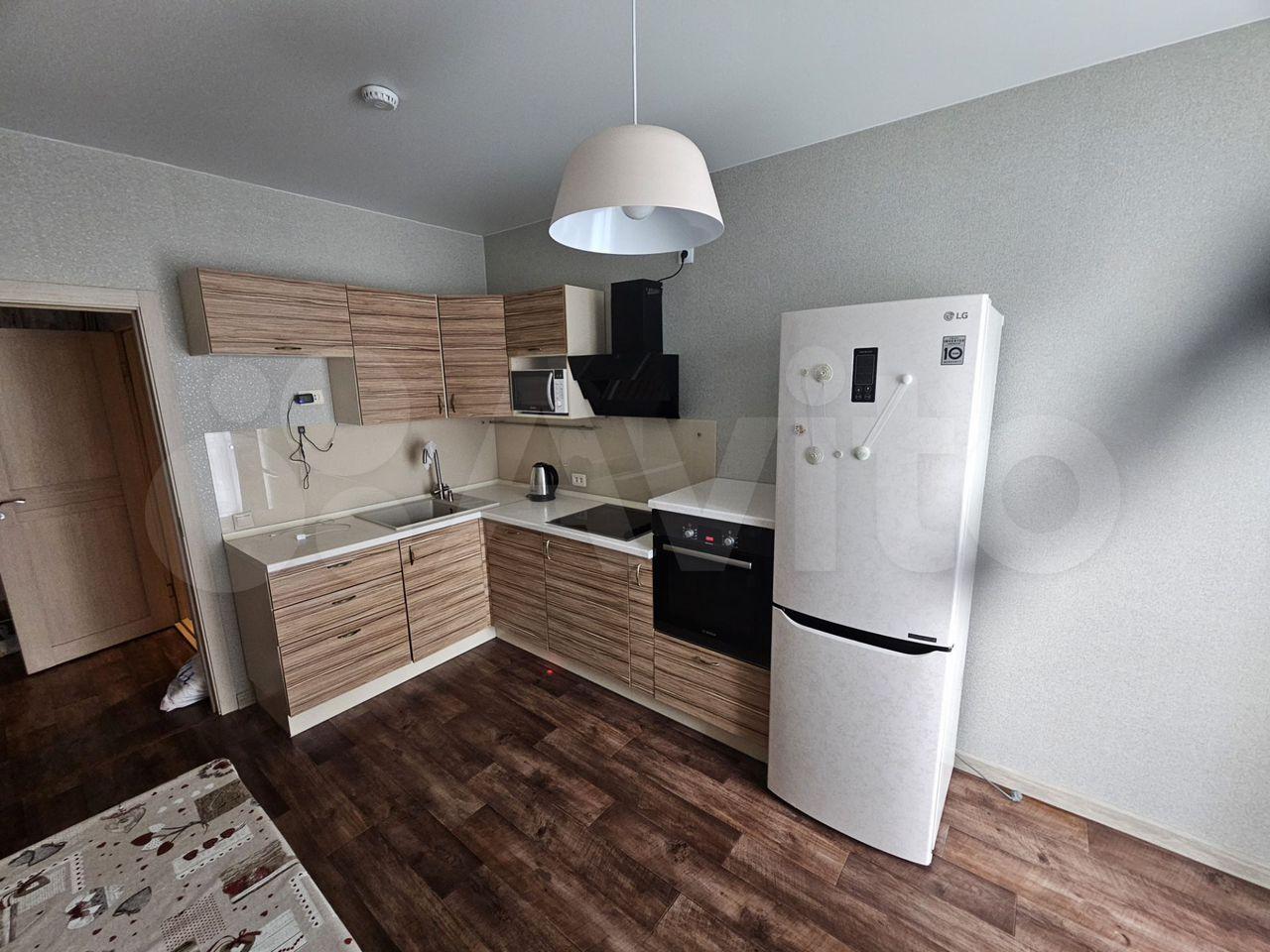 С МЕБЕЛЬЮ! Есть всё необходимое: кухонный гарнитур с барной стойкой, холодильник, печь, стиральная машинка - автомат(встроена в кухонный гарнитур), стол и стулья, кровать двухспальная, 2 больших шкафа, комод+туалетный столик, телевизор.