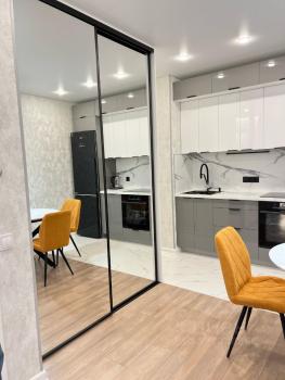 Дом новый, квартира не разу не сдавалась с новой мебелью. В квартире имеется кухонный гарнитур с обеденным столом, в гостевой комнате диван и стол, в спальне: кровать и гардероб открытого типа с комодом. В прихожей: гардеробная открытого типа, пуф, зеркало. В Ванной комнате: унитаз, раковина, ванная, стиральная машина и зеркало.
