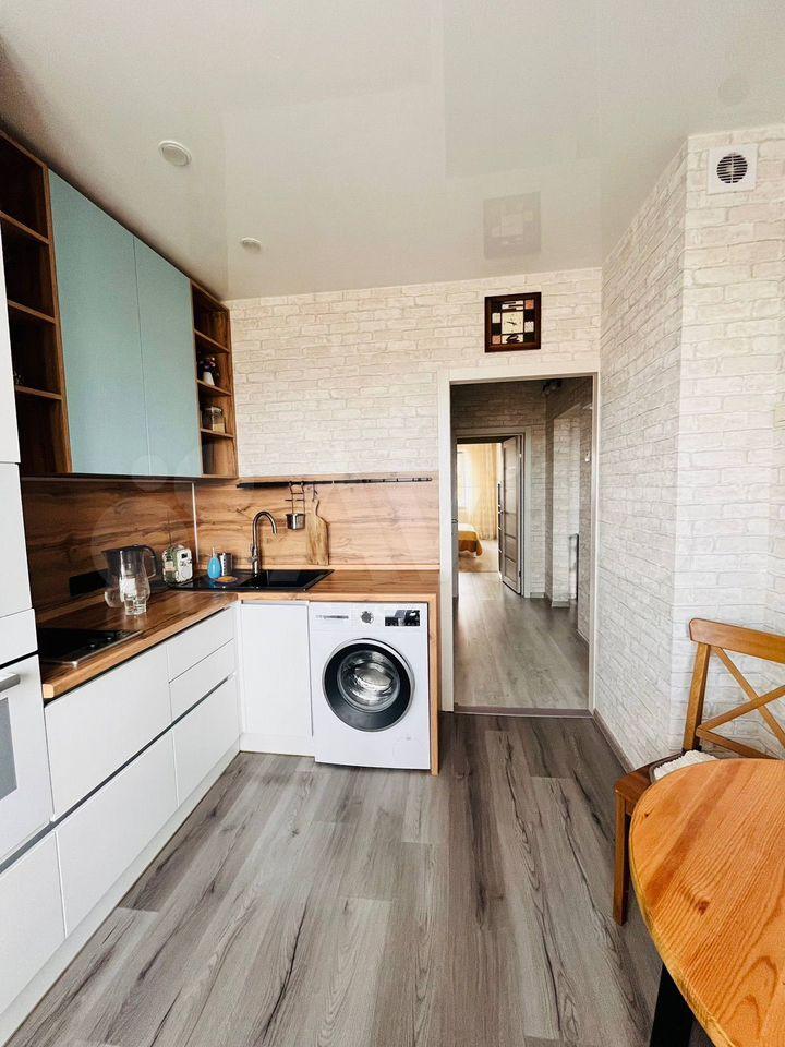 В квартире есть диван, кухонный гарнитур, варочная панель, духовка, стиральная машинка, шкафы, комод, обувницы, телевизор на кухне.