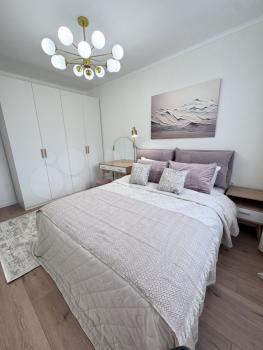 В спальне современная мебель: большая кровать, шкаф и удобный косметический стол. Ванная комната и туалет раздельные, оформлены в светлых тонах.