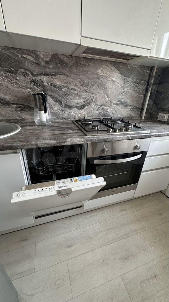 Для комфортной жизни: Уютная гостиная-кухня со встроенной кухней, духовкой и посудомоечной машиной, отдельная детская комната и большая гардеробная.