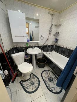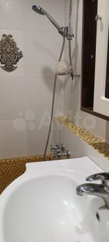 Санузел совмещён, ванна выложена керамической мозаикой золотого цвета. В ванной комнате - бойлер, шкаф , мойдодыр и пенал.