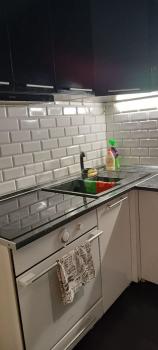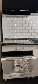 Гостиная плавно переходит в кухню, кухонный гарнитур с бытовой техникой Гаренье - вытяжка, духовой шкаф и встроенная панель, холодильник Индезит , микроволновка, чайник, необходимая посуда .