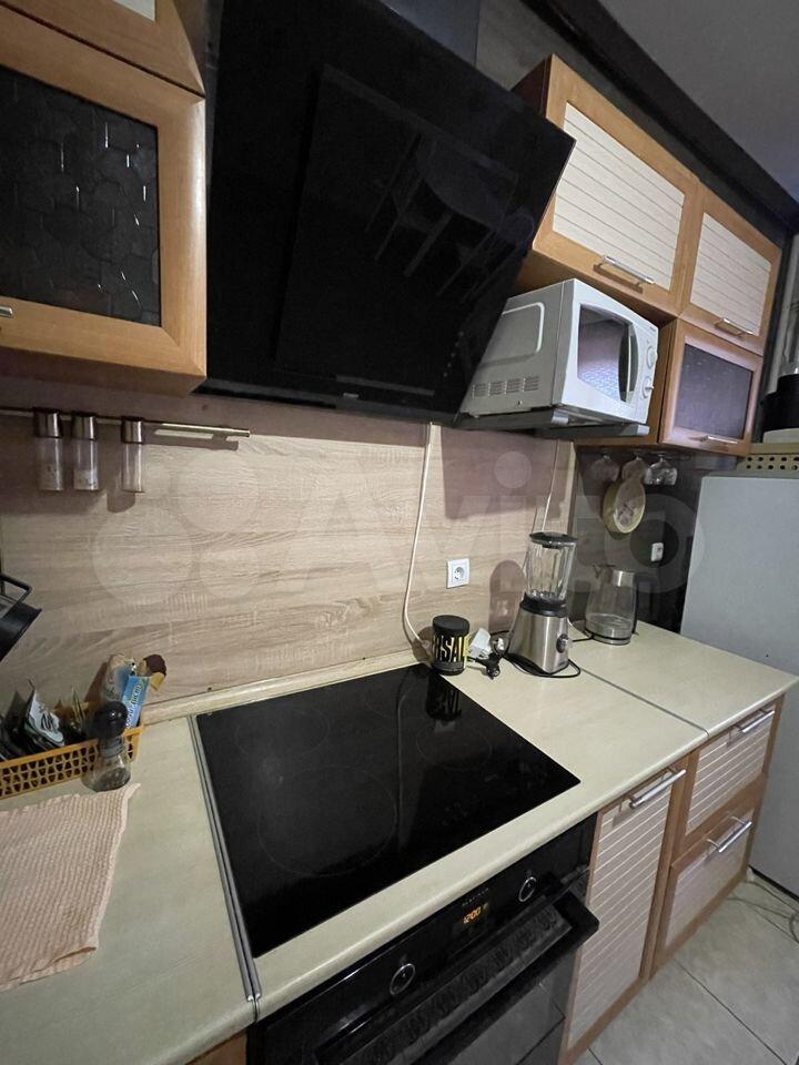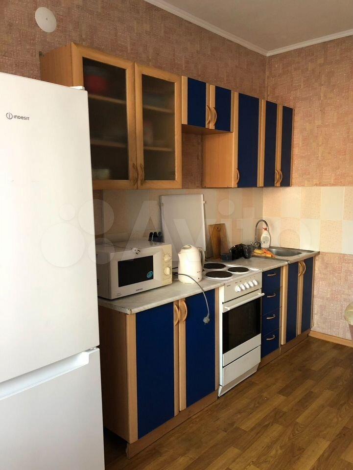 В квартире есть кухонный гарнитур, плита, холодильник, кровать, шкаф-купе.