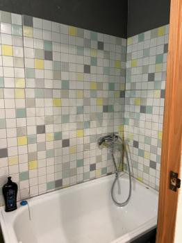 Ванная комната ( полноценная ванна небольшая) в кафеле и туалет в светлых тонах .