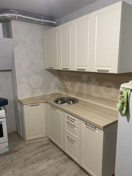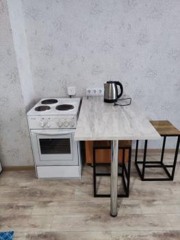 установлена новая кухня со столешницей, встроенной новой керамической варочной поверхностью, а также установлена новая раковина с немецким смесителем Wassergut. Новые стол и и три табуретки.