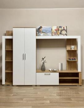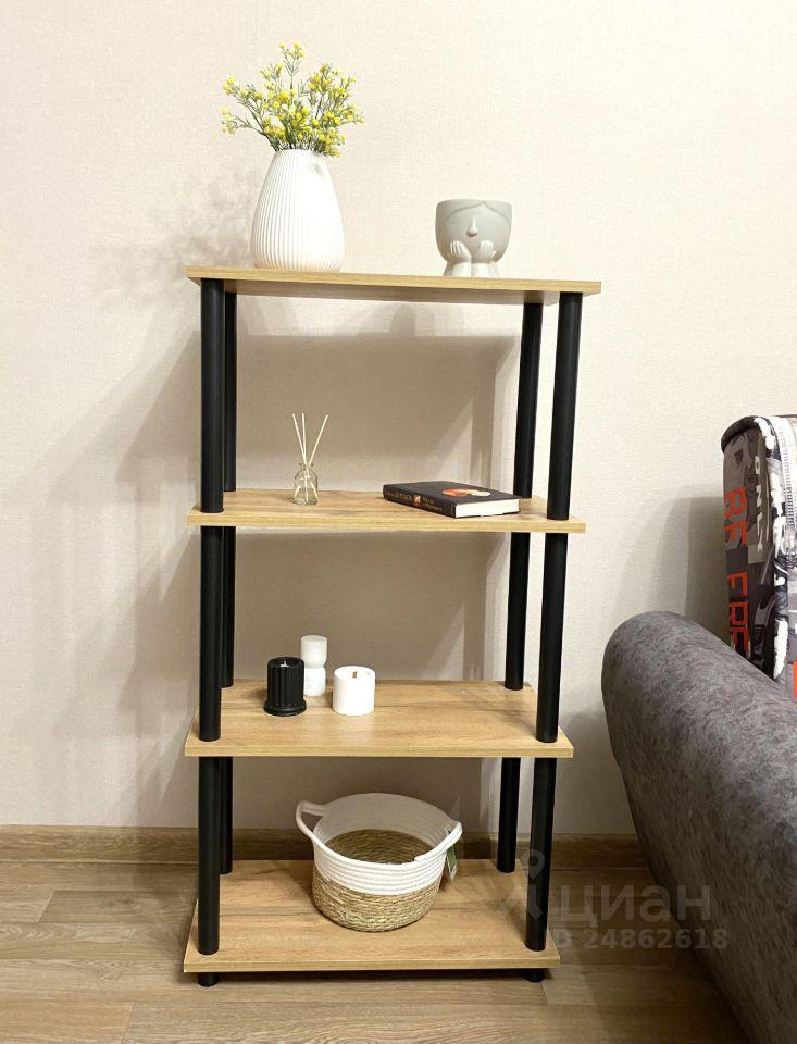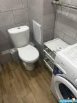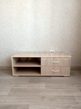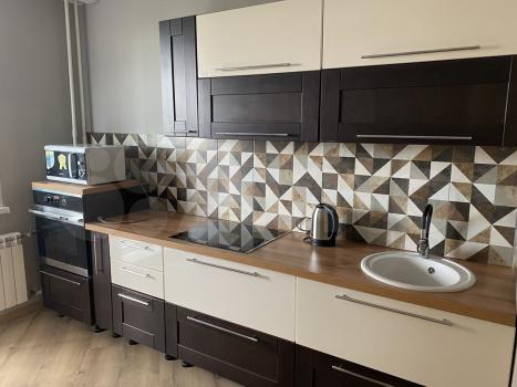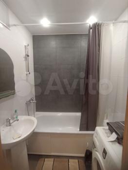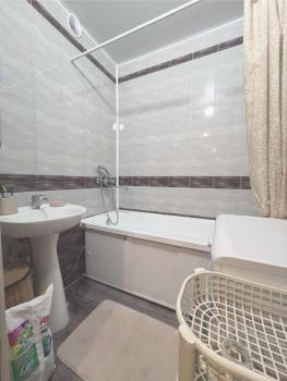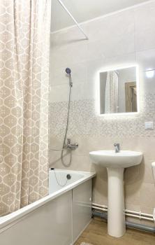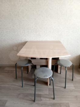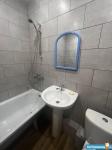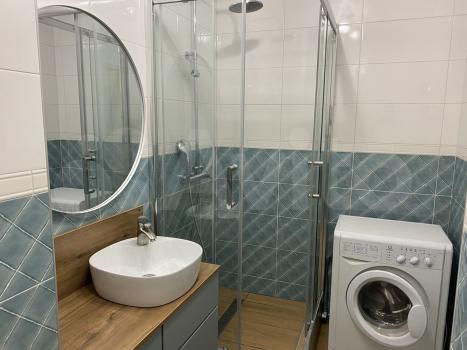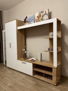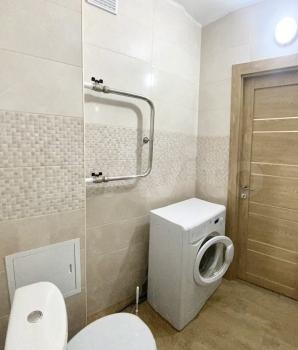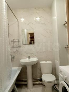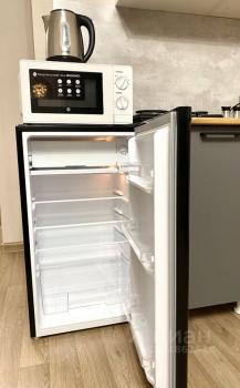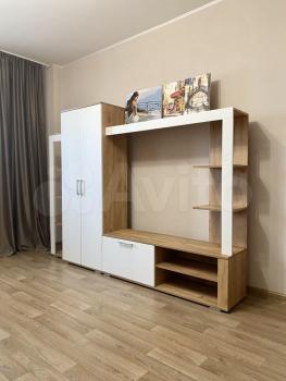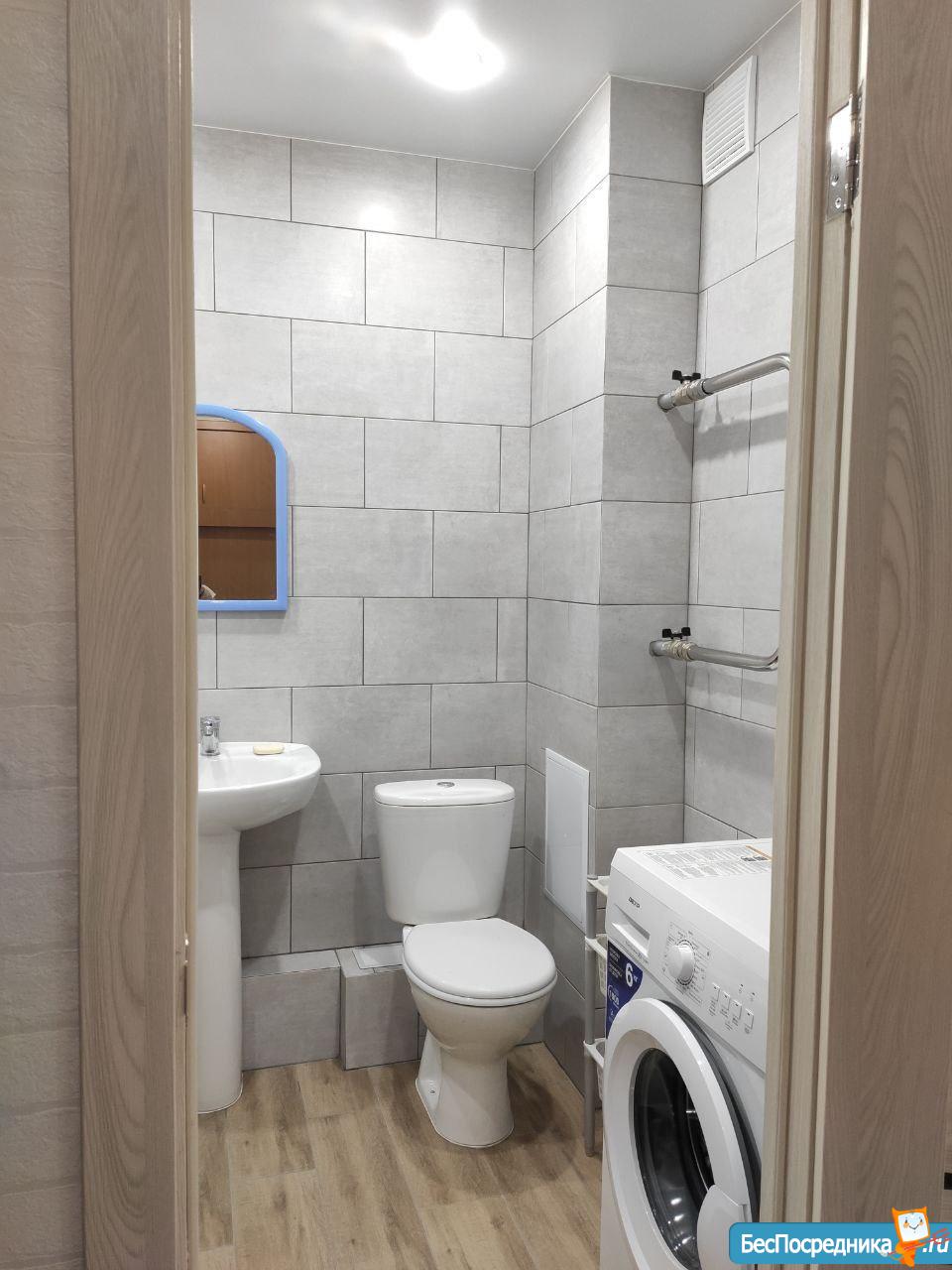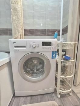 В квартире есть вся необходимая для комфортного проживания мебель и техника: двуспальный диван, стеллаж со шкафом и тумбой под ТВ, прихожая и обувная полка. Мини-кухня, кухонный стол и стулья, небольшой холодильник. Санузел в кафеле, установлена хорошая стиральная машина.