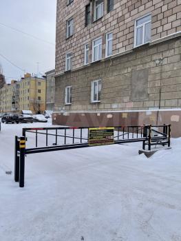 Окна выходят на проспект, двор под шлагбаумом.