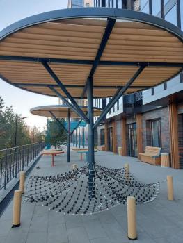 Прекрасное озеленение внутреннего двора с многочисленными зонами для отдыха детей и родителей.