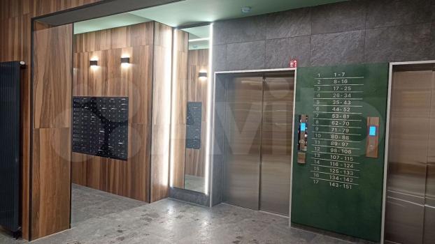 Санузел совмещенный, выполнен в стильном дизайне с качественной отделкой. Из окон открывается вид на ухоженный двор с детской площадкой и спортивными зонами. Дом оснащен пассажирским и грузовым лифтами, мусоропроводом и подземной парковкой.