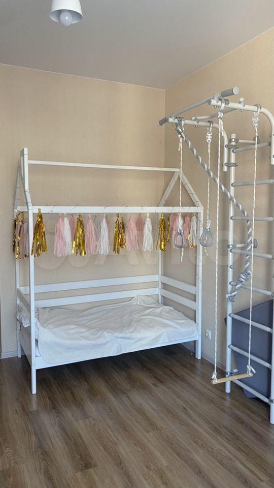 Просторная детская с кроватью и спортивным комплексом.