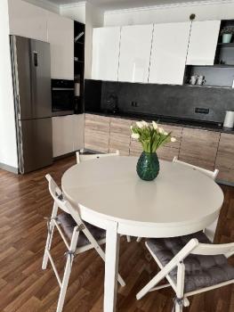 Просторная квартира в ЖК европейского уровня Южный берег. В квартире имеется все необходимое: большой кухонный гарнитур, варочная панель, духовой шкаф, посудомоечная машина, вытяжка, холодильник, телевизор, стиральная машина, мебель в спальне, мебель в комнате, стол обеденный, стол рабочий, стулья, диван.