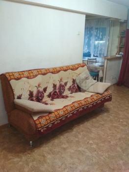 Квартира светлая, зелёный двор, с парковкой нет проблем. Спокойные соседи, подъезд чистый. Состояние хорошее. Стена между кухней и комнатой снесена, на полу кафельная плитка, в другой комнате линолеум. Плита газовая. Из мебели: диван, новая полутороспальная кровать, холодильник, стиральная машина, туалетный столик, кухонный стол, комод.