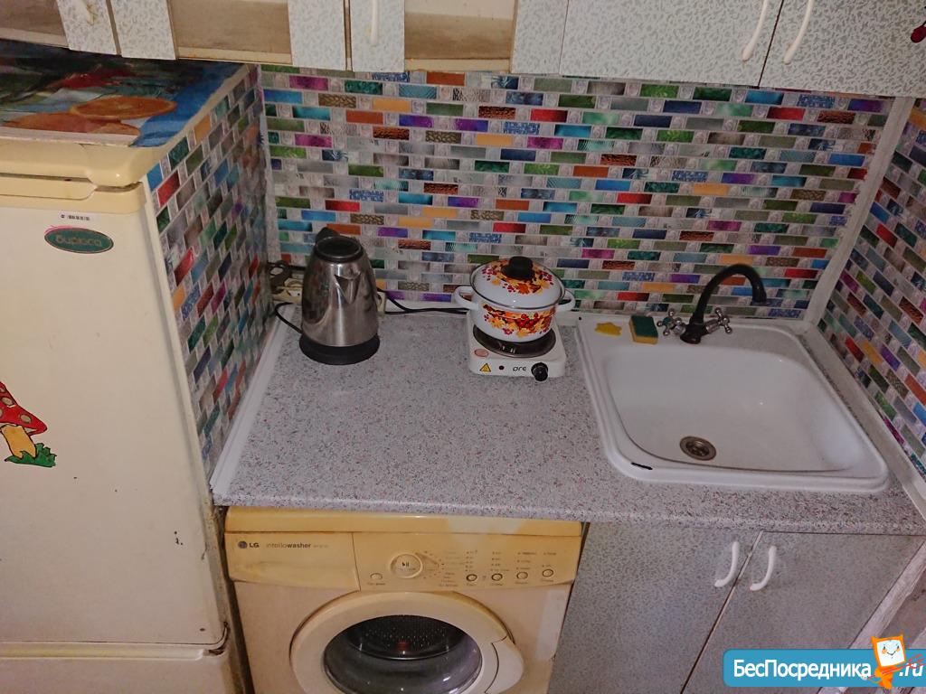 Укомплектована всем необходимым для жизни: холодильник, стиральная машинка, стол, диван, шкаф, плитка.