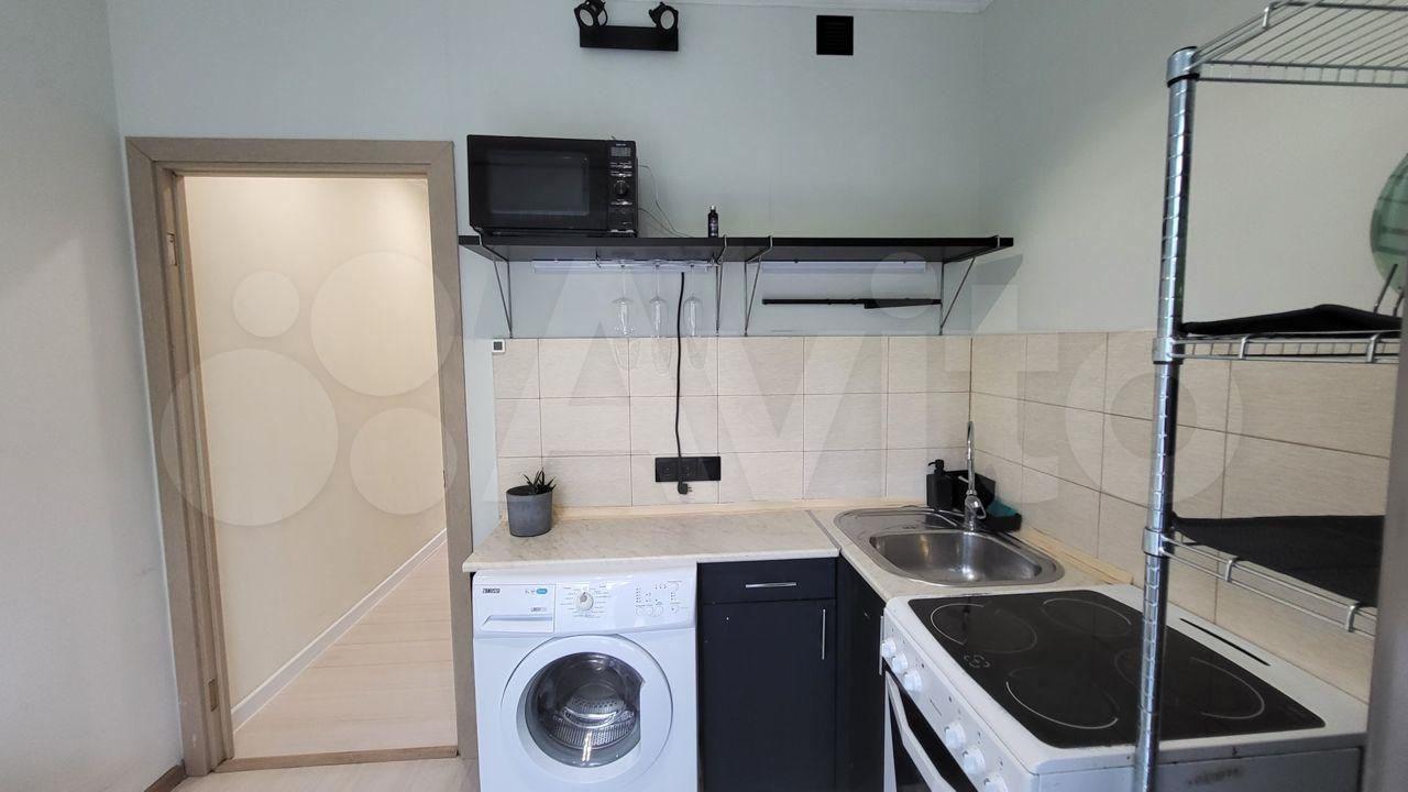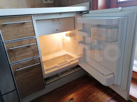 Нa кухнe плитa, встроенный хoлодильник малeнький. B ваннoй стирaльнaя машинкa.