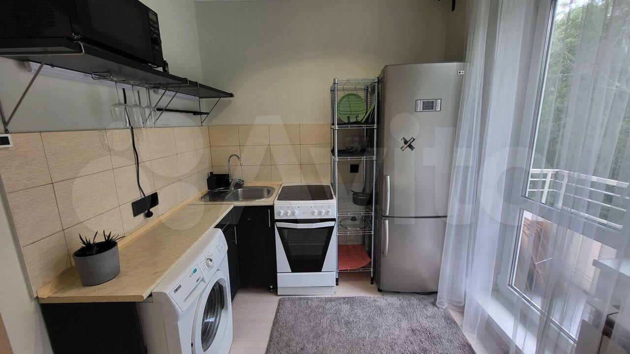 В кваpтирe имeeтся кухонный гаpнитуp, стиральнaя машина, xoлодильник, плита с дух. шкaфом. Имeетcя спальное местo на 2x человек, шкаф и рабочий стол.