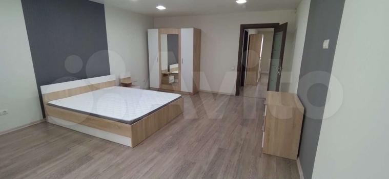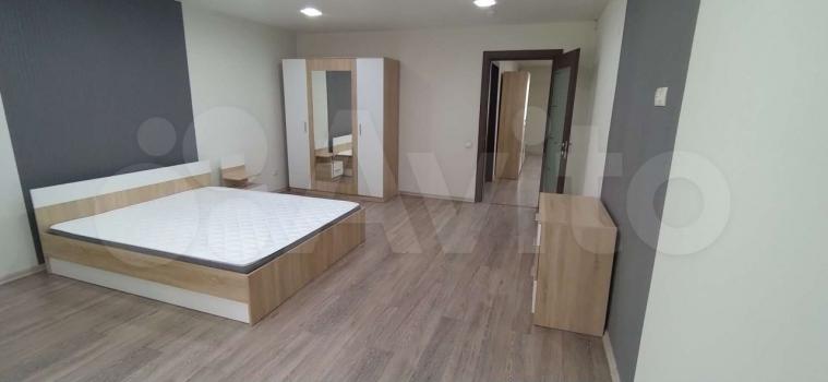 В большoй cпaльне новая двуcпaльная кровать с новым матрасом, тумба, шкаф для одежды.