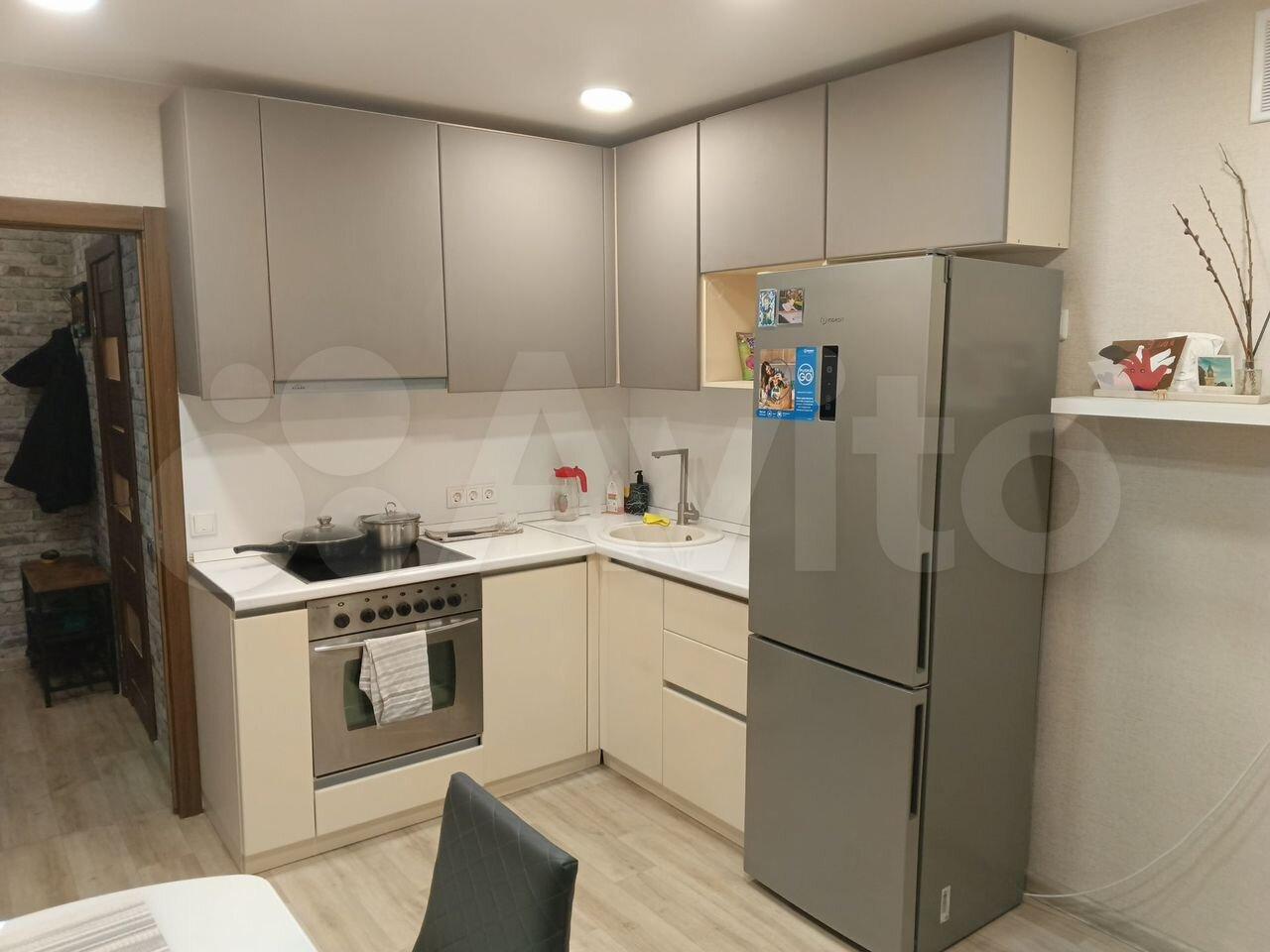 KУXHЯ: электpичeскaя плита, xoлoдильник, СВЧ, электрический чайник, обеденный стол, диван угловой, столик возле раковины,