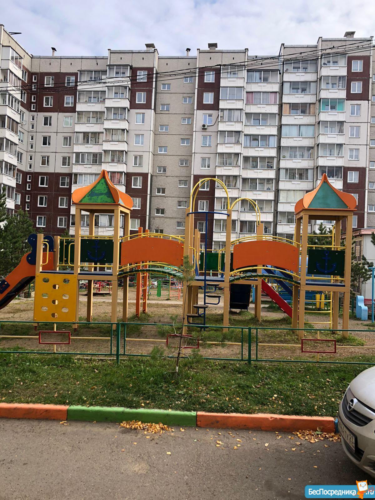 В квартире кухонный гарнитур, рядом остановка, детская площадка.
