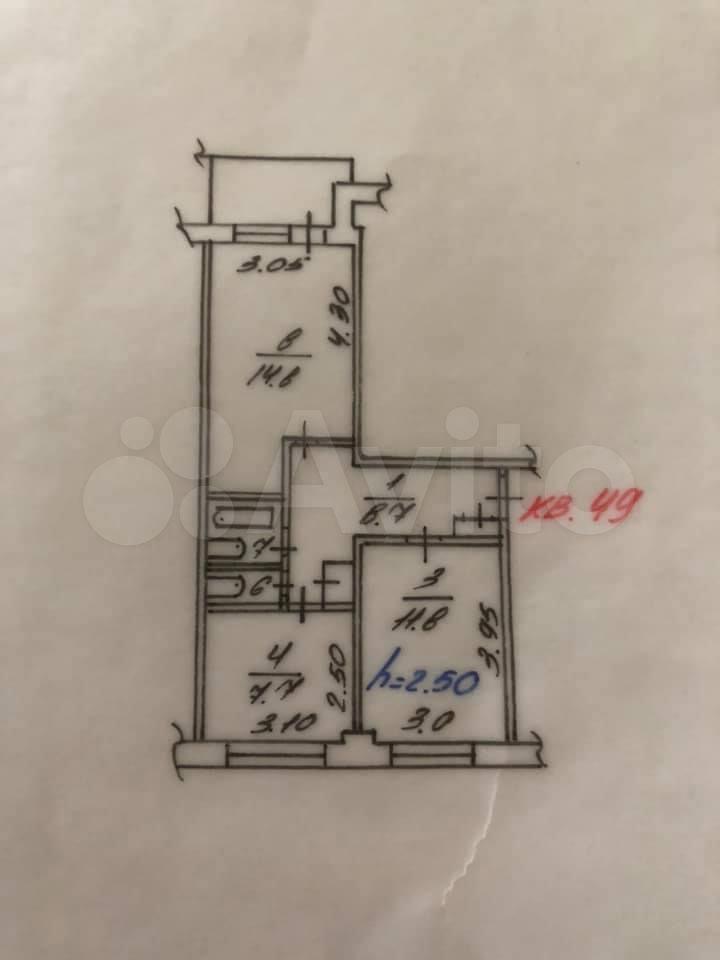 50 кв.метров. Спальня, зал, кухня. Ванна и туалет раздельно. Этаж 3, пятиэтажный дом.
