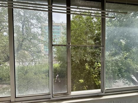Балкон застеклён пластиковыми стёклами, под окнами две яблоньки:)