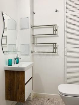 Описание и комплектация квартиры: комната отделена от кухни и коридора стенами-перегородками. В комнате кровать, комод с лампой, торшер, телевизор на тумбе. В коридоре шкаф, полка для обуви, стул. Есть гардеробная с системой хранения Elfa. Установлена кухня Мария со шкафом для встроенного холодильника. На кухне вывод и место (под столешницей) для стиральной машины. Имеется небольшой холодильник, индукционная варочная панель с четырьмя конфорками, электрическая вытяжка, стол, стул. Санузел совмещенный: подвесной унитаз, большая ванна со стеклянной перегородкой, с душевой системой с обычной и с тропической лейкой, возле ванны удобная ниша для туалетных принадлежностей, полотенцесушитель, раковина с большой тумбой и зеркалом, водонагреватель. В ванной есть система хранения Elfa, отдельный смеситель для мытья пола и других тех.нужд. Балкон застеклен. На балконе два больших ящика для хранения, стеллаж (при необходимости можно убрать). В комнате большое нестандартное окно. На окна установлена дополнительная качественная фурнитура, не продувают, не промерзают. На полу ламинат. Установлена качественная входная дверь с полной шумоизоляцией. В квартире установлена сигнализация, Интернет, ТВ (при необходимости можно отключить). Интерьерные украшения на фото в квартире не остаются.