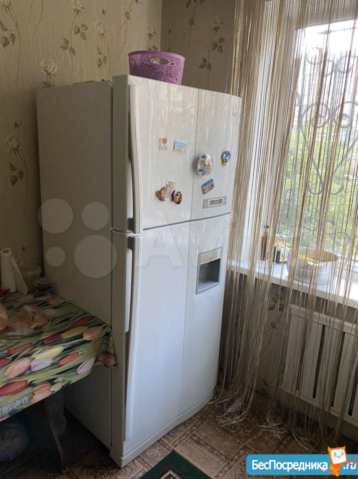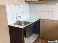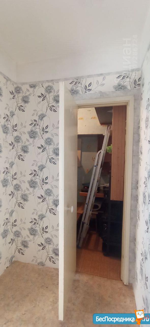 В квартире сделан косметический ремонт, из мебели на кухне: мойка, шкаф для посуды, пара столов и стульев, старенький холодильник.