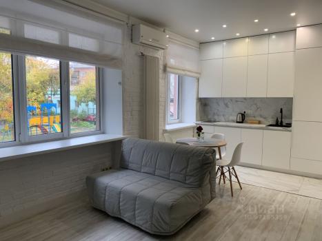 Просторная студия 38 м2 в самом центре города со свежим ремонтом, высокими потолками и большими окнами, которые выходят в тихий зелёный двор. Высокий первый этаж на уровне второго.