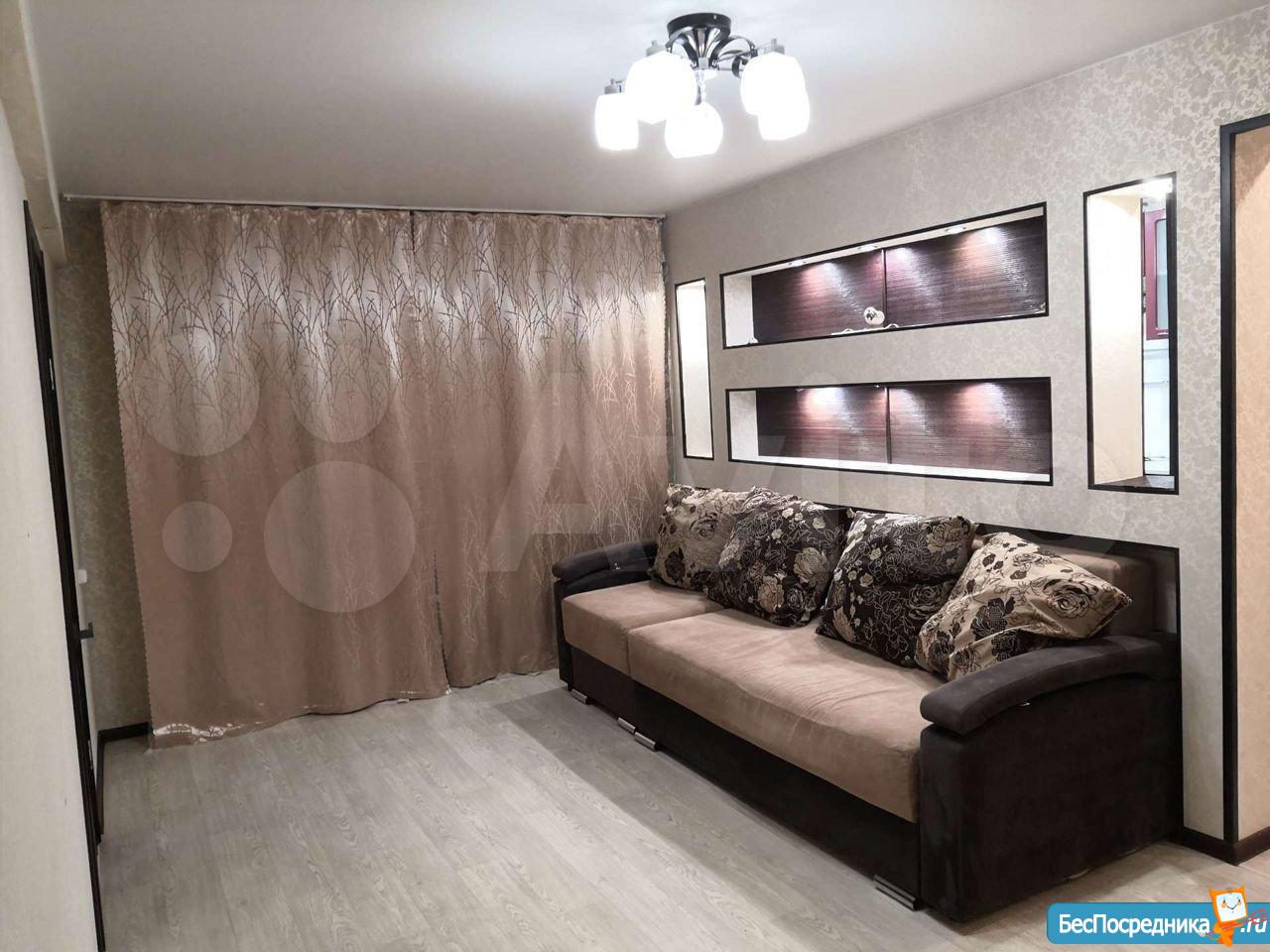 Сдается на длительный срок 2-комнатная квартира с отдельной гардеробной. Сделан хороший ремонт. Санузел в кафеле, во всей квартире пластиковые окна, натяжные потолки, полукоммерческий линолеум. Из бытовой техникой холодильник, стиральная машина, микроволновка, чайник, утюг. В зале большой 4-х местный диван. В кухне гарнитур и обеденная зона.