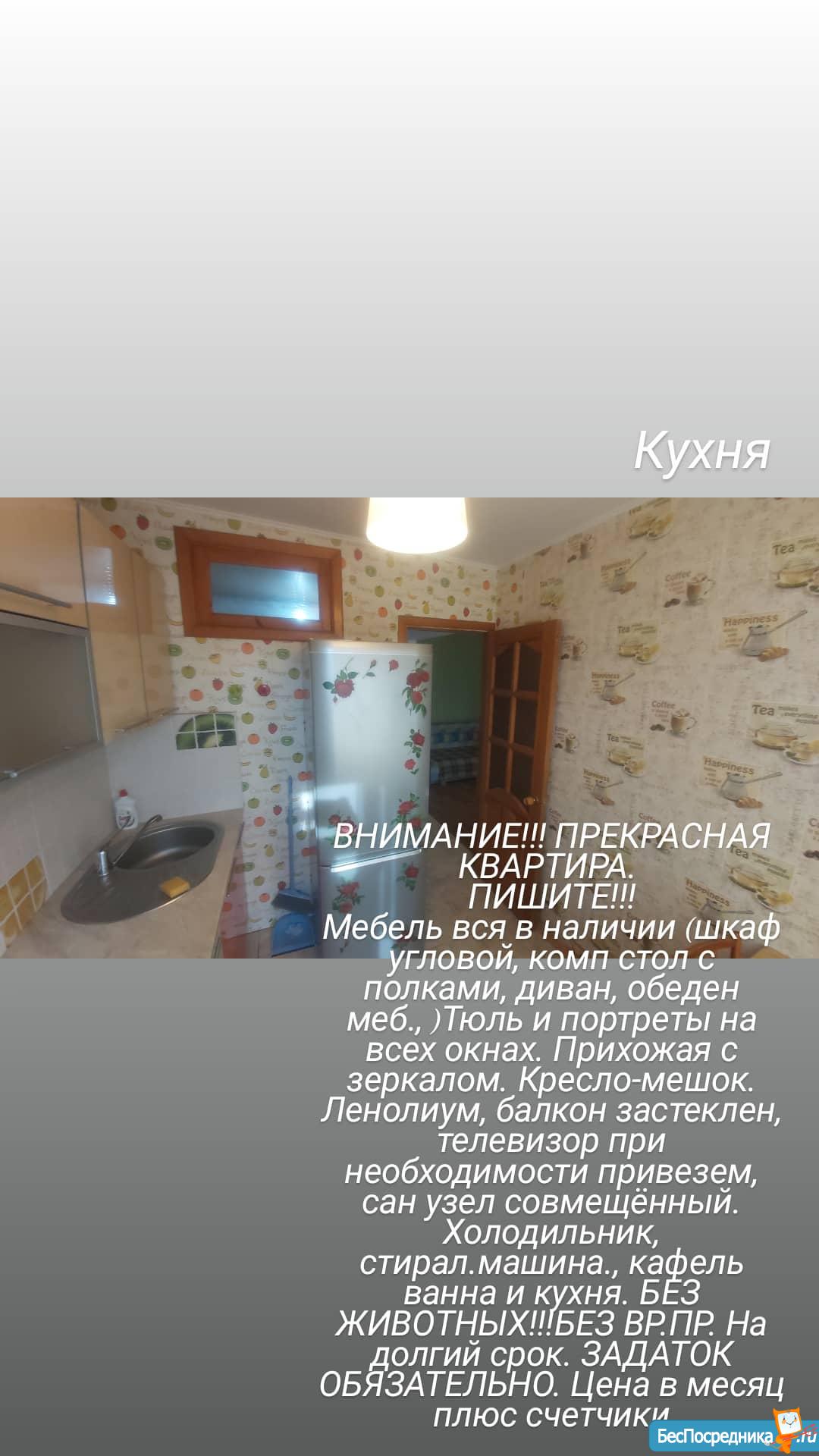 Мебель вся в наличии (шкаф угловой, комп стол с полками, диван, обеден меб., )Тюль и портреты на всех окнах. Прихожая с зеркалом. Кресло-мешок. Ленолиум, балкон застеклен, телевизор при необходимости привезем, сан узел совмещённый. Холодильник, стирал.машина., кафель ванна и кухня. БЕЗ ЖИВОТНЫХ!!!БЕЗ ВР.ПР. На долгий срок. ЗАДАТОК ОБЯЗАТЕЛЬНО. Цена в месяц плюс счетчики