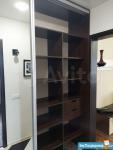 На данный момент в зале произведено зонирование с помощью штор, таким образом выделены: спальная зона с 2-местной кроватью, тумбой и комодом; зона гостиной с диваном; и рабочая зона -небольшой письменный стол и стул. В зале по всей стене вместительный зеркальный шкаф-купе.