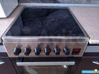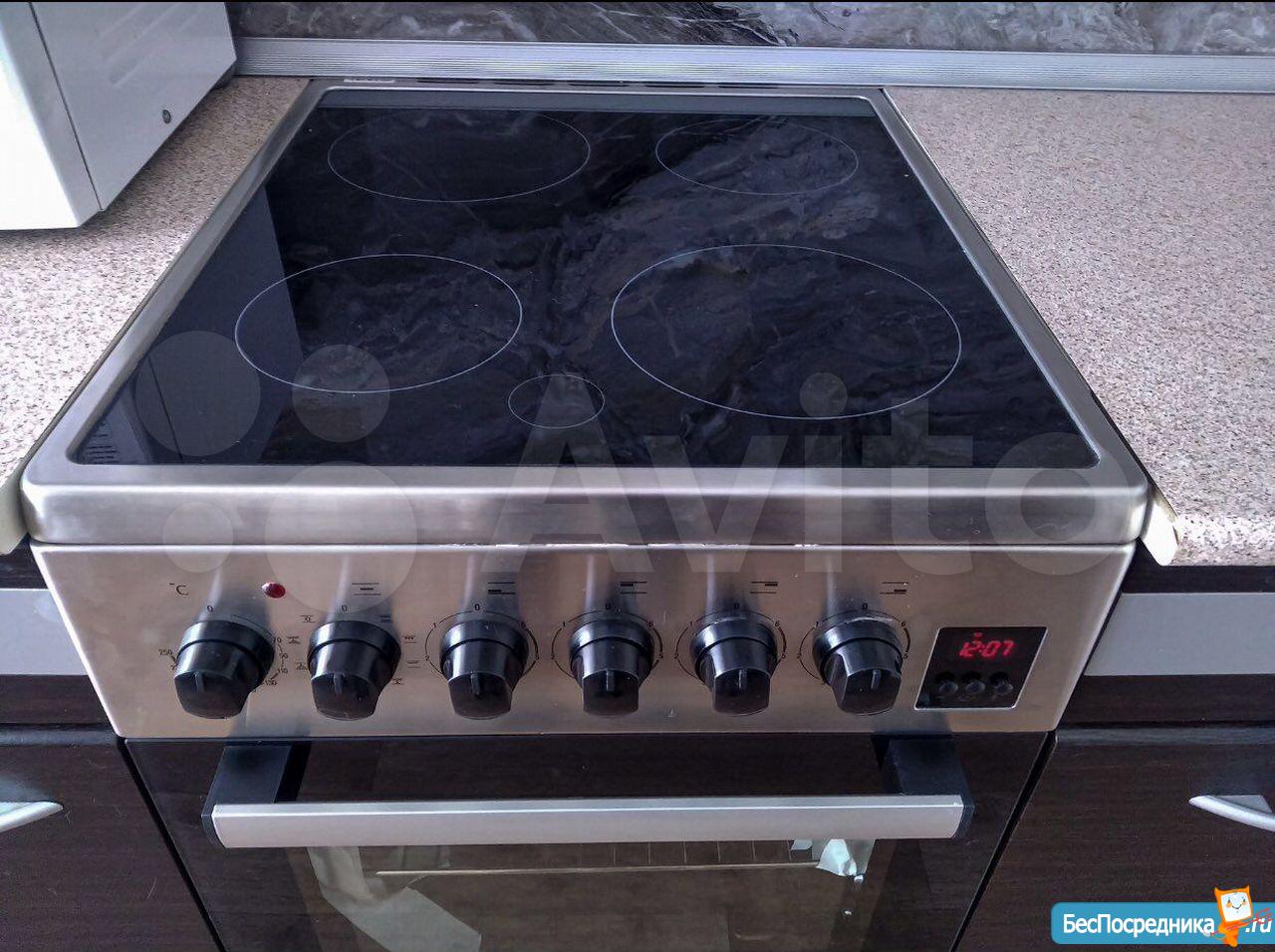 На кухне: индукционная плита, духовой шкаф, чайник для плиты, столовая и кухонная посуда.
