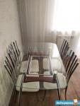 На кухне есть кухонный гарнитур, холодильник, эл. плита, стол, стулья, чайник.